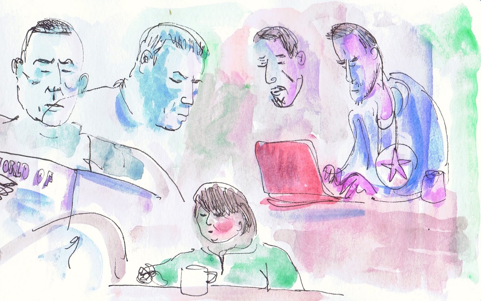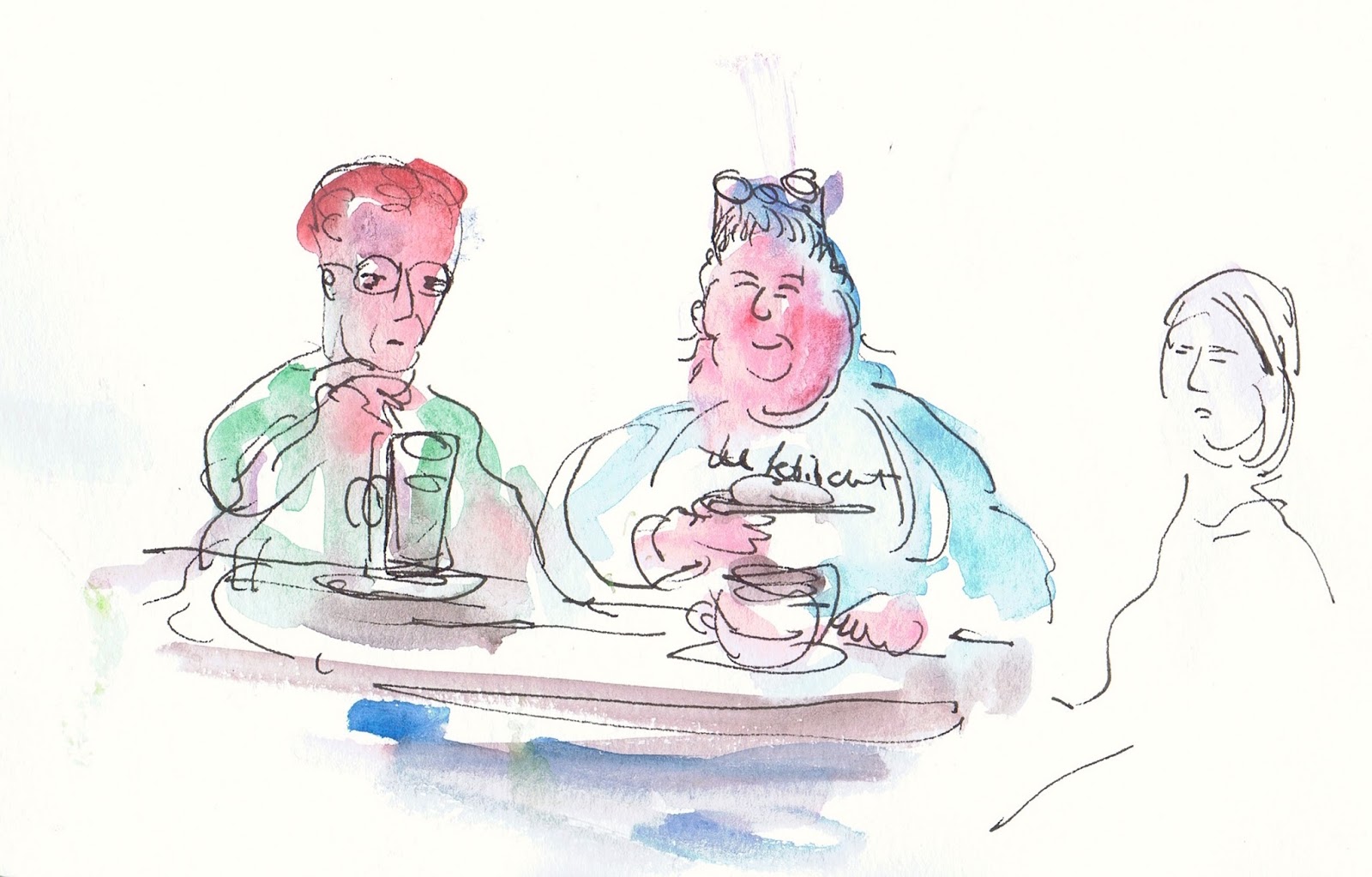 While I was in Scotland I sat in cafes writing and drawing – in both Glasgow and Perth. Here are some drawings from those damp, sunny October days, of people drinking coffee and eating cakes and working on laptops, just as I was, working on my story...