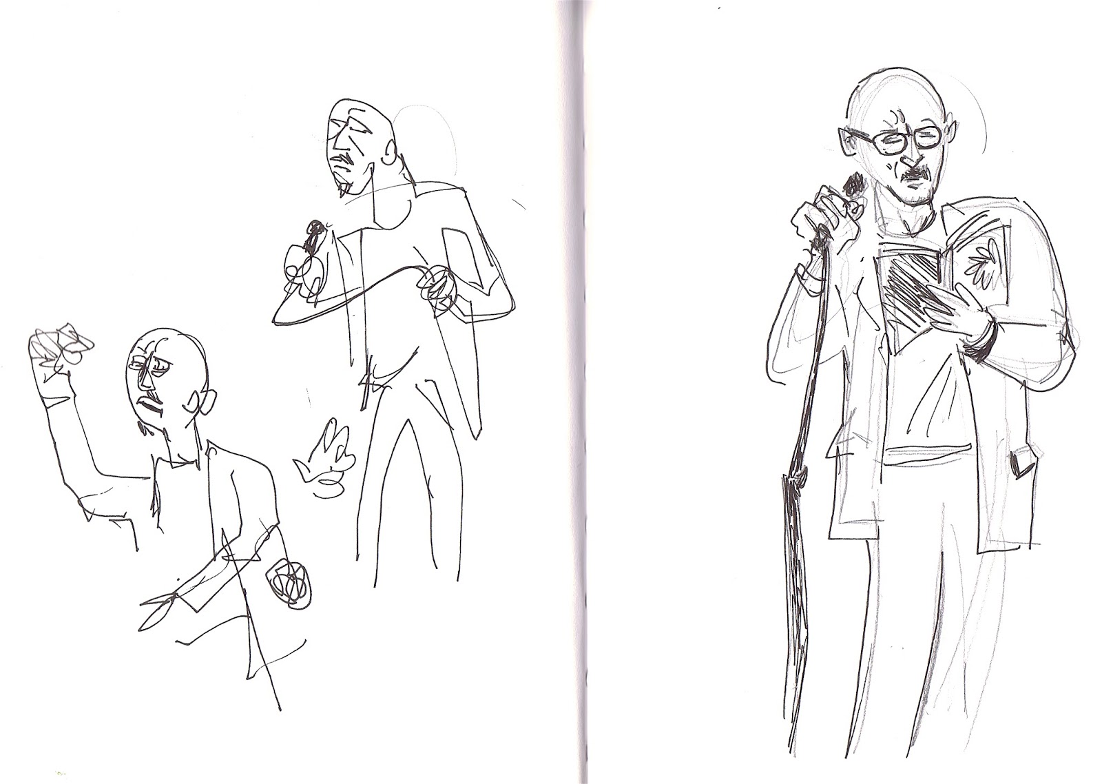 Last night, just before this busy weekend kicked off... we went to Central Library in Manchester and we saw the fab Gerry Potter perform. He was launching his new poetry collection from Flapjack Press. I drew him while he was doing his turn...