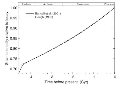 As early as the mid-1960s [pdf], scientists realized that these two lines of evidence posed a paradox: what is now known as the Faint Young Sun Paradox. It was a serious problem that required serious thought. It didn’t just mean that the evidence from geology and astronomy wasn’t meshing together. It also added a puzzle to the rise of life on Earth. Life would have had a hard time getting started on a planet of ice.