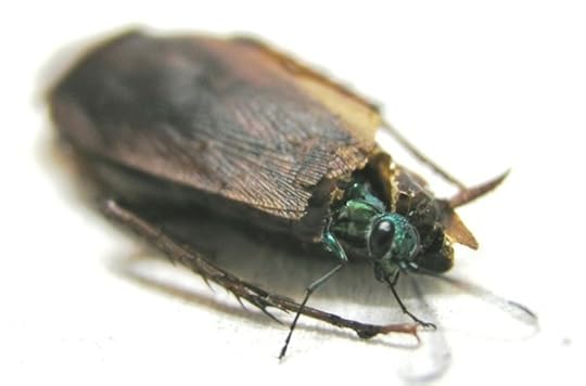 The egg hatches, and out comes a larva. It chews a hole into the roach’s underside, from which it feeds. It grows larger and larger over the course of a week. And then it crawls inside.