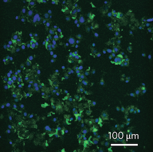 Cancer cells glow green with quantum dots made by earthworms. (The blue is from a dye that stains the nuclei of cells.)