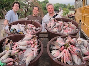 Carmelo Fruciano, Gonzalo Machado Schiaffino, and Axel Meyer check out cichlids for sale at a market in Granada, on the banks of Lake Nicaragua