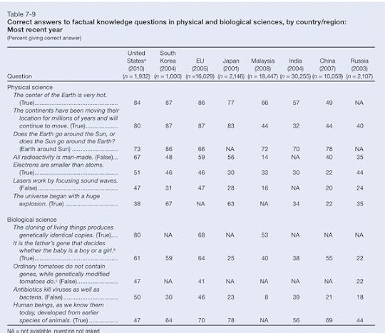 I was skimming through the new Science and Engineering Indicators 2012 from the National Science Foundation when I came across this very interesting table. Whenever I see reports about science literacy in the United States, the reports are very parochial, with no comparison to other counties. Here is a table of scores on similar tests given around the world. We Americans do relatively well on a lot of the questions (although that sometimes means we’re about as bad as most other countries). The one big exception is when Americans are asked about the origin of the universe and of our species.