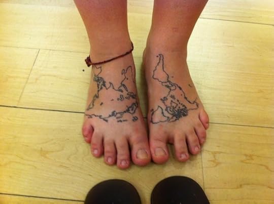 I'm a student at MIT in the Earth, Atmospheric & Planetary Science Department hoping to solve the glacially-coupled climate problem of global warming by developing efficient carbon sequestration technology. In honor of our beautiful mother Earth, and as a constant reminder of the places I can go under my own human power, I had the world map, minus Antarctica, tattooed on the tops of my feet in a Mercator projection.