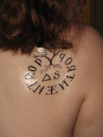 "My first year of college, I wanted to be an English major," she wrote, "and I took Intro Chemistry to fill the science requirement. The brief unit on thermodynamics made me fall totally in love. Entropy made sense to me–-scientifically, philosophically. I became a Chemistry major and love every second of it. I got the tattoo to mark my rite of passage–Entropy going both ways, with its symble delta-S in the middle, all supported in the roots of Yggdrasil, the world-tree of Norse mythology (harking back to my English-lit days)."