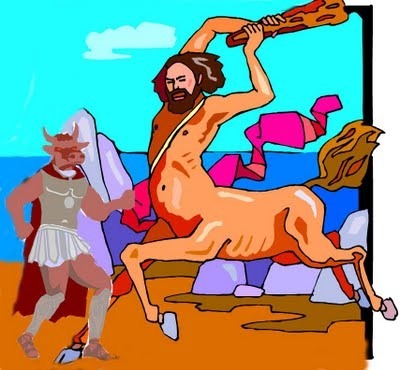 AA said...Okay, here goes: Are the minotaurs the bad guys just because they pollute water, or is there some other reason? So the centaurs are peaceful. If they don't do anything requiring frontal lobe development, they might as well be mindless animals, right? What makes them not mindless animals now? Do they have cities? Poetry? Art?