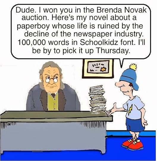 The opening bids are high, probably because starting at $5.00 with $5.00 increments takes forever. So if you, like most of EE's minions, are barely scraping by, this probably isn't for you. But if you make charitable contributions every year, and get nothing in return other than a tax deduction and the satisfaction of helping some worthy cause, here's your chance to get back all of that plus get your book proofread, edited, and critiqued by EE.