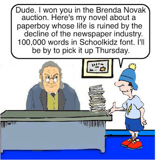 The Brenda Novak Auction is underway. In fact it's been underway for hours and a few editors currently have bigger bids placed on them than Evil Editor. Remarkable when you consider that other editors offer a mere evaluation of your work while EE actually edits it line by line, and that most editors evaluate 30 to 50 pages, while EE edits your whole book.