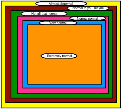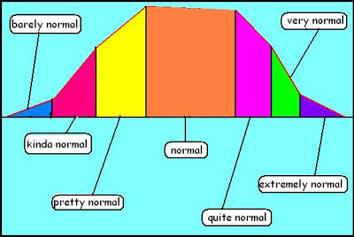 Note that the biggest section is "normal." That's because for stuff to be considered normal, there has to be plenty of it. But if I were to create a graph showing the normalness of normalness, the biggest section would be the "extremely normal" section, because by definition, being normal to the extreme is what makes something normal.