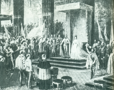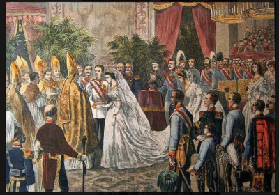 Since Sisi was not the Archduchess’s choice of wife for her doted-upon son, the Archduchess was delighted when Sisi herself asked to delay a formal betrothal until she was sixteen. Thereafter, Sophie’s fault finding of her niece became relentless, but not in Franz Josef’s presence. There is little his mother can do to change his mind without overplaying her hand. Nevertheless, the battle lines are drawn. And because Archduchess Sophie was no fool, her enemy was never Franz Josef, but the not-yet-sixteen year old prospective bride with neither the training nor the desire to become a Habsburg Empress, nor the expertise to deal with a venomous prospective mother-in-law. The Archduchess took advantage of her son’s fiancee’s youth and naivete, and criticized her mercilessly, but when Franz Josef’s infatuation did not fade, the wedding proceeded as planned. As appropriate to the groom’s station, it was held in Vienna, on April 24th , 1854, in the presence of the Viennese court and a thousand assorted guests. As soon as the vows were spoken, Elisabeth’s Bavarian waiting-ladies were sent home. The ensuing struggle is the major theme of the first half of the novel, and leaves no clear winner.