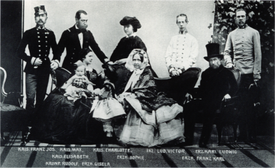 Franz Josef at the left, Sisi seated with her children, Sophia center foreground,