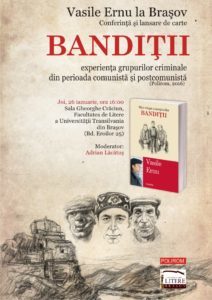 Joi, 26 ianuarie, de la ora 16:00, în Sala „Gheorghe Crăciun” din cadrul Facultăţii de Litere a Universităţii Transilvania din Braşov (Bd. Eroilor 25), Vasile Ernu va susţine conferinţa „Bandiții – experiența grupurilor criminale din perioada comunistă şi postcomunistă” pornind de la cel mai nou volum al său, apărut în colecţia „Ego-grafii” a Editurii Polirom, disponibil şi în ediţie digitală.