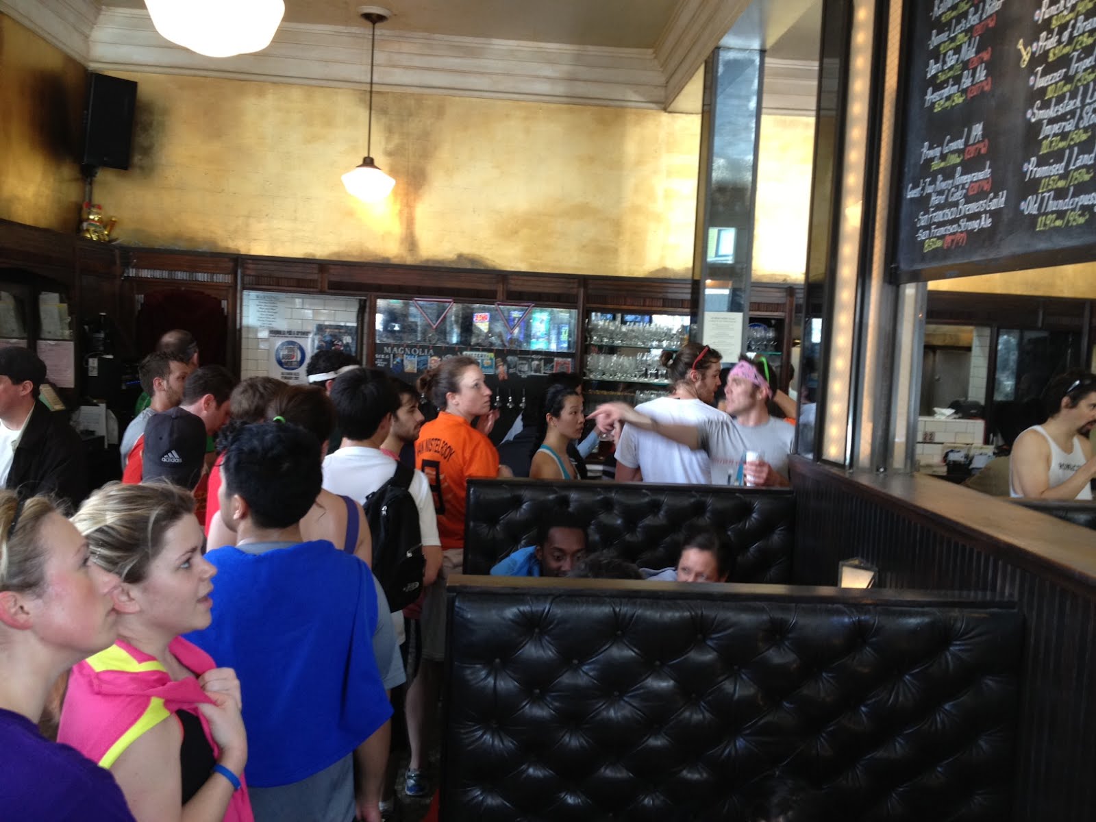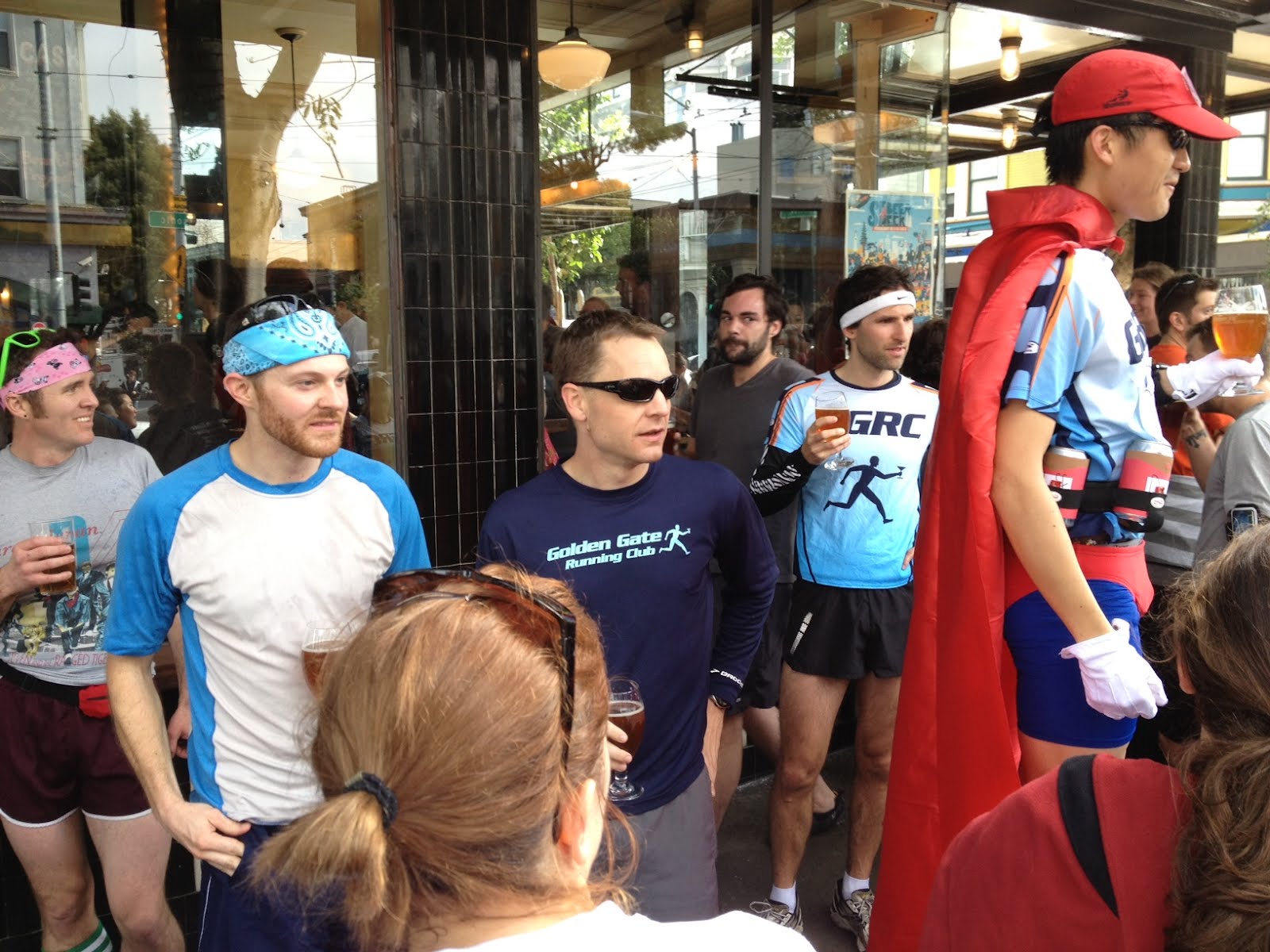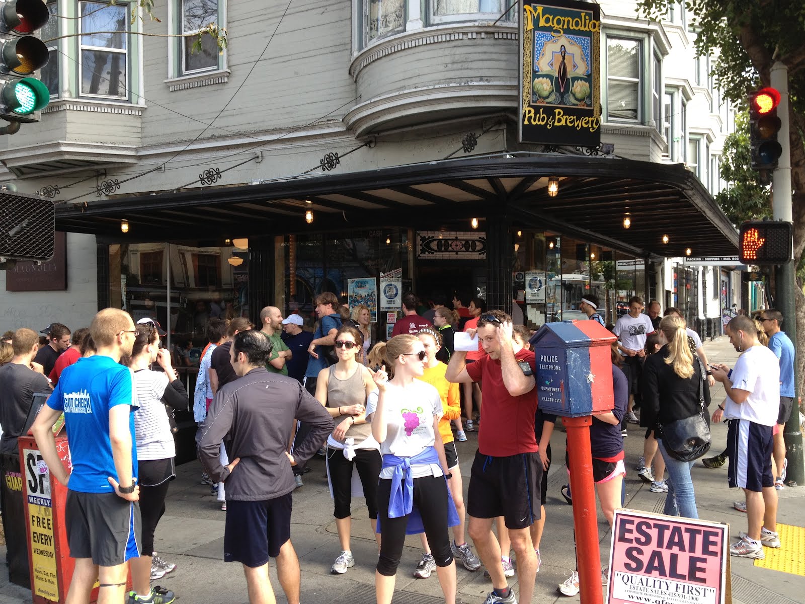 It's seriously a fun event. Meet at a brewery (Social Kitchen & Brewery). Run en masse through the east end of Golden Gate Park and the panhandle. Enjoy an optional beer at Magnolia (it's Strong Beer Month!). Run past the Flower Conservatory, some people throwing a Frisbee, and the swans at Stowe Lake in the park. Then dash back to Social for a beer. Bam, you just ran up to 5 miles. You've earned it.