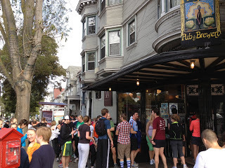 The 3rd Annual Beer Run was a whopping success. I even ran 99% of the 5-mile course despite figuring I'd take the point-A-to-point-B-back-to-point-A 5k course. Yep, I earned that post run beer. "Only one post run beer?" you ask. Well that speaks to what a rousing success it was, if I may put a li'l spin on it. The organizers, Ramblings of a Beer Runner's Derrick Peterman andThe Brew Lounge's Bryan Kolesar, and myself, exceeded our expectations by drawing roughly 125 fellow beer runners. Despite its growing attraction, we hope to keep it casual (permit-free and not a logistical nightmare). Gotta love SFPD for having a cop on the force who, upon seeing the throng bolting down 9th Avenue and toward Golden Gate Park--some of whom donned costumes this year!!!--shouted, "Hey, where's the keg?!"I'd planned on stopping at the "midway point," Magnolia Brewpub, for a light Kolsch this year, but even I didn't have the patience to wait in the line some 50-deep that our clique had created! I recall effortlessly ordering one of their Strong Beer Month offerings last year as one of maybe 8 people who'd stopped for a beer. This time, we caught Magnolia so off guard, they corralled the runners in an impromptu beergarden and have pledged to come up with a solution for the 4th Annual.