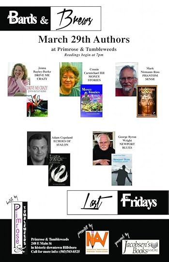 Are you a lover of reading and good drink and live in the Portland-Hillsboro area and want a fun night out? Come to “Bards & Brews” sponsored by Jacobsen’s Bookstore and Northwest Independent Writers Association. Drink your favorite wine or beer while I read the prologue from the sequel to “Echoes of Avalon,” and Mark Niemann-Ross, Jenna Bayley-Burke, Connie Carmichael Hill, and George Byron Wright read from their wonderful works.