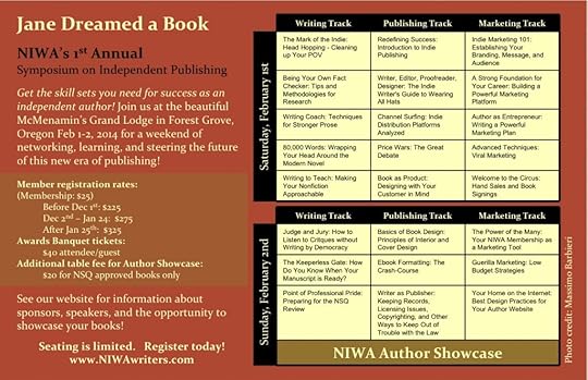 Do you have a great story you wish to share with the world, but don’t have time to wait for “permission” from a traditional publisher? With today’s technology and resources you can bring your creation to life and make it available to a wide audience. Learn every aspect of making that happen at Northwest Independent Writers Association’s First Annual Symposium on Indie Publishing this next February 2014: http://www.niwawriters.com/register1.html