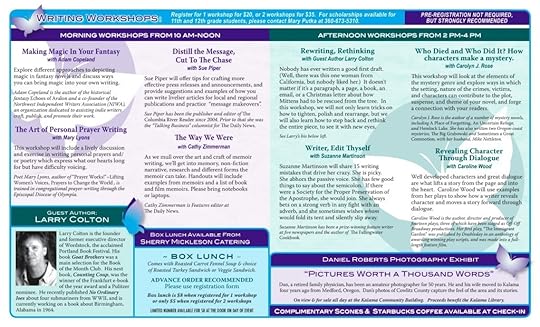 Yours truly will be an author presenter at Kalama’s Word Catcher Literary Festival Saturday, April 21st. I will be hosting a workshop on “Making Magic in Your Fantasy.” The idea is to analyze the various ways magic is portrayed in fantasy novels (from the visual presentation to the mechanics of how magic works and exists in the story), and how you can make magic happen in your own writing.