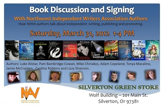 MARCH 31, 2012 – SILVERTON, OR–The Silverton Green Store, Wolf Building, 201 Main St., Silverton, OR, will host a book discussion and signing with Northwest Independent Writers Association (NIWA) members on March 31 between 1 and 4 PM.