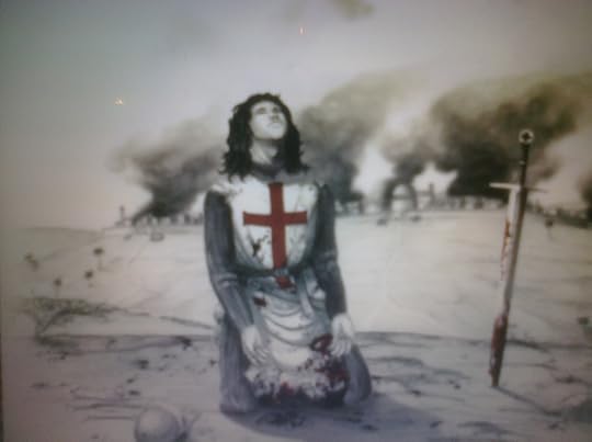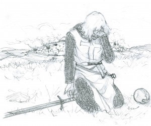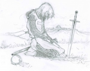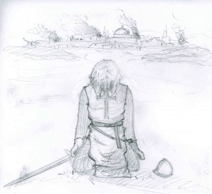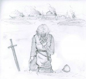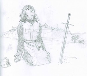 For the most recent image we were working on I sent him the written description: "Image1 (Black and White, pencil/charcoal): Patrick is on his knees before a burning Jerusalem circa 1099 AD. He is wearing chainmail with a white surcoat over it. The surcoat is smeared with soot and blood. It also has a red cross emblazoned on the chest (classic 'Crusader' style). The cross should be bright red and the only color in the image. Patrick has a 'What have I done?' look on his face and his arms hang limply at his sides. A Norman style helmet (conical cap with nose card, a la 'Bayeaux Tapestry') rests up-ended on the ground near his knees as if he just took it off, set it down, and it is in the process of rolling away."