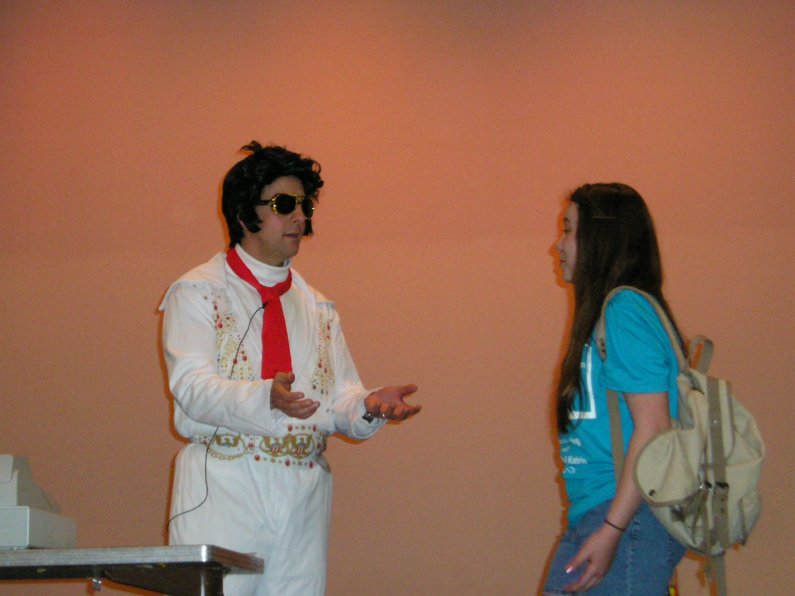 Another "book excerpt" skit was done by a teacher (who played Elvis) and a student (who played Sammy). They did the scene from Justice Jack where Sammy goes into Maynard's Market and the Elvis impersonator (who only speaks in Elvis song titles) is working the register. (Some of you will recall this exact excerpt from the ARC giveaway contest we had last year.) (It's also the beginning of Chapter 24, in case none of this is bell-ringing in your brain.)