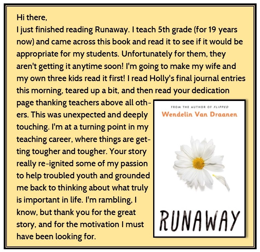 I have gotten some beautiful, heartfelt letters from teen readers over the years. But this week, eleven years after Runaway went out into the world, I got a letter from a teacher. (See sidebar.) What he wrote made me weepy-happy because it tells me that yes, he understood. Yes, he felt it. And yes, it made a difference.