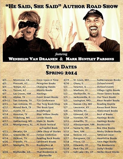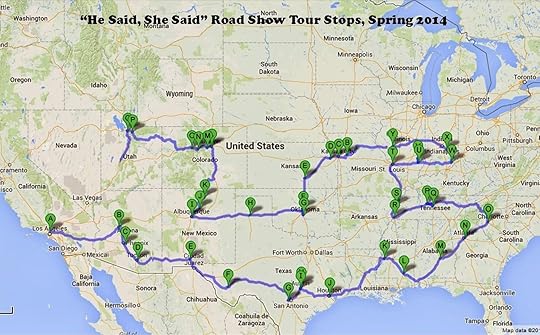 Here's the schedule for the Spring leg of the "He Said, She Said" Author Road Show. (We plan to have the Fall 2014 schedule--visits to the "north half" of the country--ready sometime this summer.) Hope to see you out there! (And please share with anyone you think might be interested!)