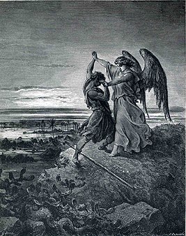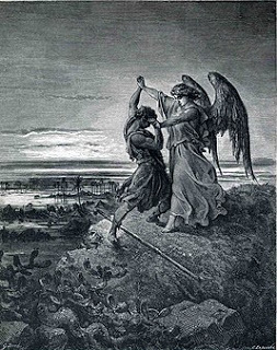 and the Angel locked in battle, pushing against each other, the angel’s wings raised above the scene. And I know, we often like to personalize this story. I know we tend to look at this battle between ourselves and God.