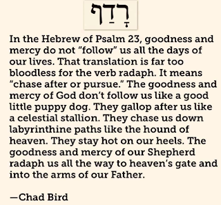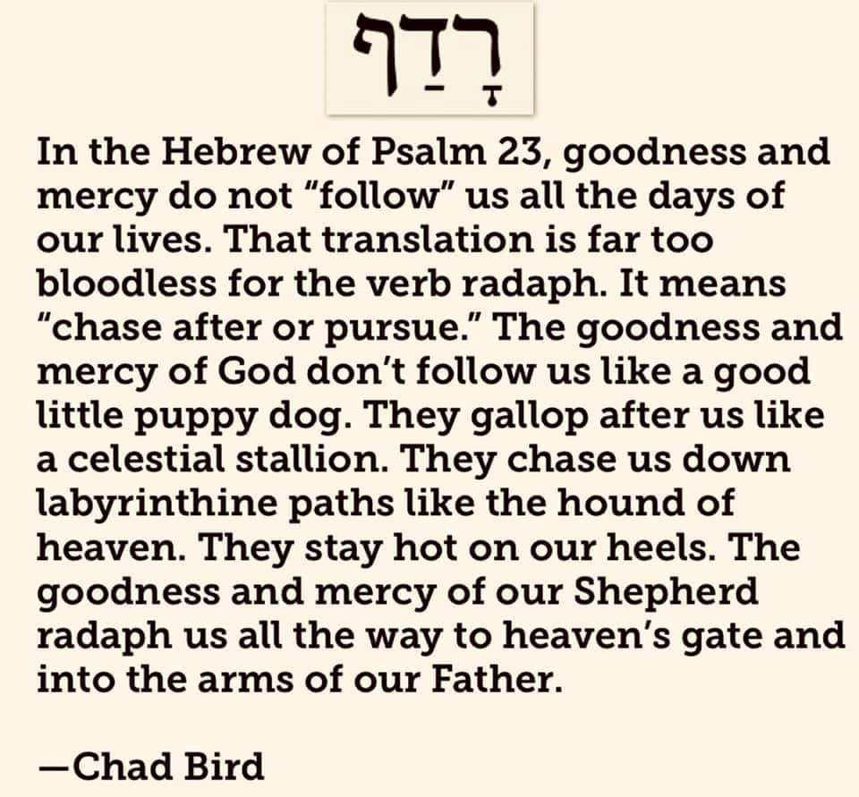 We have a God whose goodness and mercy chases us and seeks us out. A God whose goodness and mercy follows us wherever we go and whatever we do.