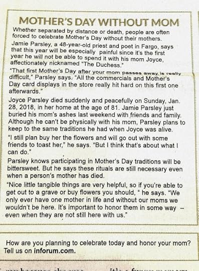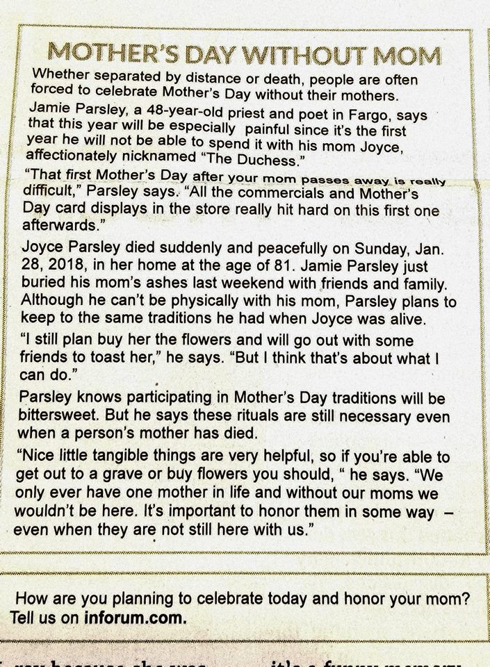 Here's an article from today's Fargo Forum in which I was interviewed by April Knudson about the first Mother's Day without Mom.