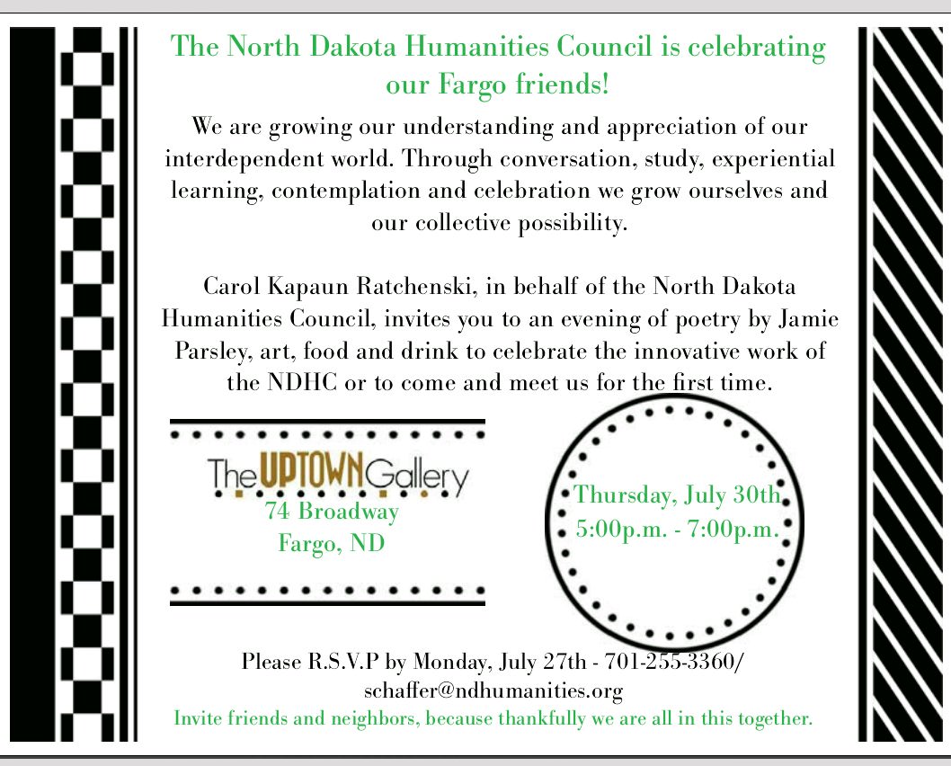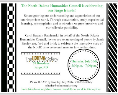 I will be reading tonight at the Uptown Gallery in Fargo (74 Broadway) at the North Dakota Humanities Council Social/Friendraiser. Mark Vinz will also be reading. 5:00 to 7:30 pm (the reading begins about 5:30). Join us for what will no doubt prove to be a fun night of poetry, art, food and drink.