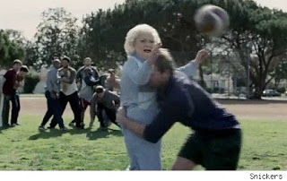 + Have you seen those wonderful Snickers commercials from a couple of years ago? You know the ones. One of my favorites is the one in we see Betty White playing football with a bunch of young guys. At one point, poor Betty gets tackled. One of the guys then comes up to Betty, and says, “Mike, you’re playing like Betty White out there.” A young woman—Mike’s girlfriend, we presume— then comes over to Betty and gives her a Snickers bar. She eats it and magically she turns back into—Mike. We then see Abe Vigoda gets tackled.