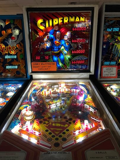 I played some of my favorite tables, from Bride of Pinbot to Bad Cats to Scared Stiff, and enjoyed a couple I’ve never gotten to see before, like the wide body Superman table and the Data East edition of Star Trek (not the older Bally table pictured above “in the shop”.