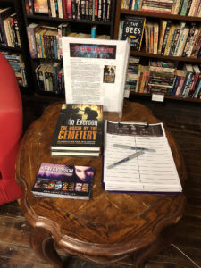 It was a great night, and a perfect location… the place where I sat to do my reading and discussion was in the midst of a bunch of old science fiction paperbacks from Hal Clement, Isaac Asimov, Edgar Rice Burroughs, Poul Anderson, Keith Laumer, Charles Eric Maine and more, many of which I own (and which influenced me to become a writer). So it was like sitting among old friends while talking to friends.