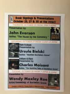 On October 25th, I did a discussion, reading and signing at the Vogt Visual Arts Center in Tinley Park, IL. The Center has been hosting a month-long “art of Bachelors Grove” exhibit, so it was the perfect place to hold an event for The House By The Cemetery. Thanks to the art show organizers, the FOX TV interview and Daily Southtown article about the book, a good bunch of people came out, including two of my high school classmates and my high school guidance counselor who used to drive me to high school from Tinley.