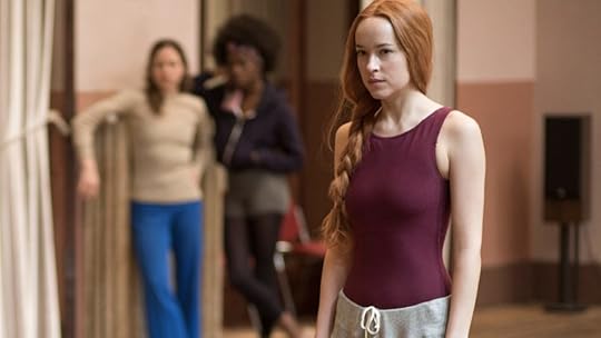 In Guadagnino’s film, all the color is stripped away, bringing a completely different bleak mood to the story (the first introduction of any real color comes in the big dance performance, when all the dancers wear provocative ropes of red). The music is minimal (the plaintive theme is by Radiohead’s Thom Yorke) and in fact, there are dance numbers staged without any music at all (which lends an odd jerky visual feeling to them). The dance academy is a utilitarian highrise building (unlike the rich old world building in Argento’s version) and everything is filmed with a grey wintery caste. It constantly seems overcast and rainy, and the backstory of a politically divided Germany in 1977 with bombs going off in the streets intrudes on the mysterious goings-on at the academy. The external political divide is reflected in the division between the witches of the Tanz Academy, who at one point stage a vote on who will continue to lead the house that is very narrow (and will play into the finale).