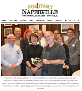 On Halloween (Wednesday) around 5 p.m., I did a live reading of the Prologue of The House By The Cemetery during a presentation on my “path” as a writer to the local Naperville, IL downtown Rotary Club. They were a wonderful, fun audience, and I met Nancy Quigley, the owner of Quigley’s, the local Irish Pub I frequently write at. That was an unexpected bit of “cool.”