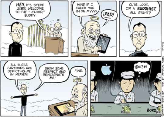 Comic by Matt Bors at http://mattbors.com/While during his life, Steve Jobs may have flip flopped between atheism and believing in God; he undoubtedly saw something amazing as his consciousness was leaving his body. What do you think he saw?Humanity has studied, forced on others and experienced God during most of its existence. You have the "highly rational" atheists on one side and the highly religious on the other. I fall somewhere in the spiritual end of it. While I'm not into forcing my opinion on what I think about all of this; I will slightly push my thoughts on you with this piece...because I can and if you're reading this far; you may be hooked.I am not an atheist; but I can respect why some may be not believe in God or an afterlife: religion has been more than a little twisted throughout the times. I'm talking about all religion. If we all subscribe to much of what the religionists believe in, it means that God don't want us to dance, have much sex (not just premarital sex), women can't wear pants, some religious sects must take chances with snakes biting their asses, can't have any alcoholic drink, God must get your money (at least 10%) in order to "please" Him, etc, etc, ad nauseum. You can live right according to the religion rules, you're not making God "jealous" by worshiping Buddha statues, or crosses/ crucifixes (um, oops), you're paying your tithes, you're only singing and listening to a "joyful noise", you attend church regularly; and then you're taught about Armageddon, which frightens the collective crap out of most people. You hear about the "end of the world through fire. You read about some locusts and diseases. My kid mind would ask, what's up with the God thing? He seems bent on controlling too much of what He built in us naturally, He's jealous (which is scary when any creator of the universe is jealous, because I know how bad it could get when an old girlfriend is jealous...not good), He likes tearing up stuff, even when we're doing okay with following most of his rules... and then He ultimately can't and don't control an angel who was a part of His crew; one who eventually starts his own realm and crew. But he only likes the really bad people on earth.It can be hard for someone with a logical mind and who's intrinsically good and tend to take responsibility for their own actions; to absorb this and believe it wholeheartedly. Someone reading this, just made a connection...that maybe religion can help assist some people in becoming atheist. Understand that I believe that religion is great and needed. I'm not thrilled with the idea of a world totally devoid of religion. I just believe that the "truth" lies somewhere in the middle of all this. I don't see or feel God as much in a church; but see and feel Her when I'm at the beach or in the mountains. Just as hundreds of people were inspired by God when they wrote various poems, stories and those words were put together and made into the bible; I feel just as much that the words that I've sprayed out of my head and put into this blog; are inspired by God.