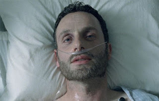 We go back to the start with Rick in a comaThe storyline - Rick gets bitten and ends up in coma. He wakes up years later and Morgan's there watching over him. Unusually for him he's smiling. "When I heard a walker had taken a snack out of someone's arm and survived, I knew it'd be you."