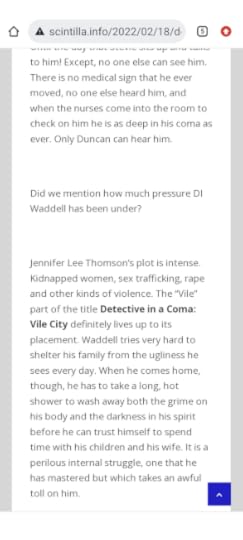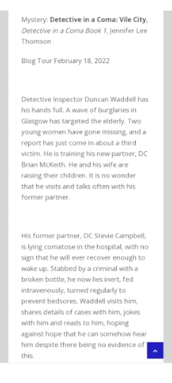 Here's one for Vile City (Detective in a Coma Book 1) from @ShazzieRimmel at https://sharonbeyondthebooks.wordpress.com/2022/02/23/jennifer-lee-thomson-detective-in-a-coma-volume-one-vile-city/ who took part in my blog tour.