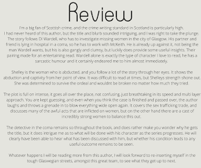 I'm a big fan of Scottish crime, and the crime writing standard in Scotland is particularly high. I had never heard of this author, but the title and blurb sounded intriguing, and I was right to take the plunge. The story follows Di Waddell, who has to investigate missing women in the city of Glasgow. His partner and friend is lying in hospital in a coma, so he has to work with McKeith. He is already up against it, not being the man Waddell wants, but his is also gangly and clumsy, but luckily does provide some useful insights. Their pairing made for an entertaining read. Waddell alone is exactly the type of character I love to read, he has a sarcastic humour and it certainly endeared me to him almost immediately.