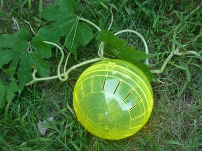 1. Okay, you've all convinced me that our pumpkin will need light to finish ripening, so here is Cindy's Squirrel-thwarting Attempt Number 2! I slid the pumpkin into an old hamster ball we had at home.