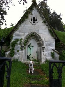 Here is a picture of my dog, Mickey, in the cemetery that inspired ZOMBIE HOOKERS.