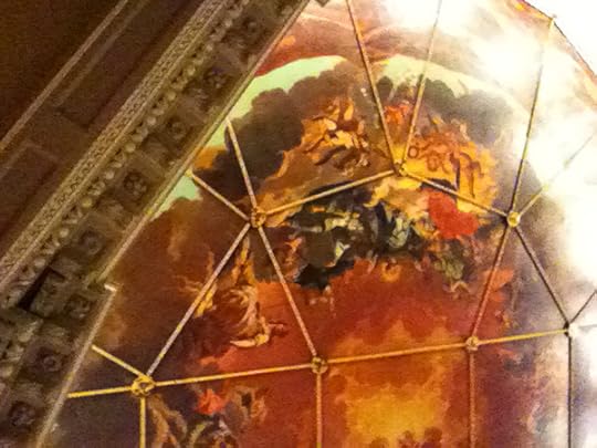 Looking up at the Sheldonian ceiling during the string quartet, I saw this (just a cell phone snap). The place was designed by Christopher Wren, architect of the famed St. Paul’s cathedral of London. I had some fun looking at the odd polygonal shapes on the ceiling of the Sheldonian, speculating about how Wren put them together, and about how one would go about constructing this pattern in some convincingly unique way. Visualizing a short article in Mathematics Magazine about this, but not quite getting the key insight.
