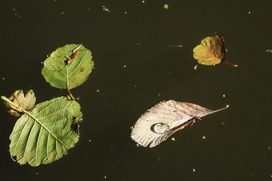 Sitting by the Cherwell for a peaceful half hour there, I’m looking at the leaves on the passing stream, thinking of them like planets in the galaxy, and that one drop of water on the one leaf is a tarn, a sea, home to thousands of microbes, like us lifing on our Earth, drifting amid cosmic debris.