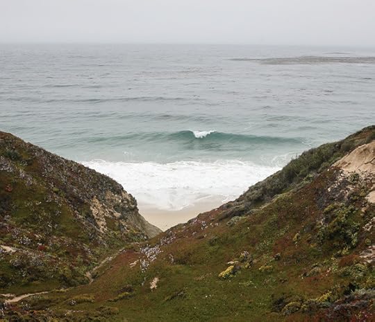 I just finished Chapter 14: Churchill Downs. Featuring that giant “myoor” creature I painted last week. I did about ten or fifteen type/print/mark-up cycles on that chapter. Scribbled & typed papers accumulating like drifts of snow. When I totally can’t face the stress/joy of writing anymore, I get into a painting, go biking, go to SF, or go to Four Mile Beach north of Santa Cruz, photo above.