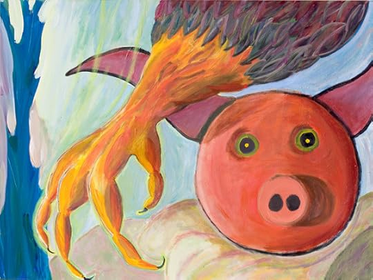 I want to write about some creatures called gubs in my novel The Big Aha. A gub is a small green pig from the Higher World, about the size of a football, with floppy triangular ears, and in place of a curly tail, a writhing bunch of purple tentacles. One of them might appear in your room, go gub-gub-gub-wheenk! Then streak across the room and disappear right before ramming into your wall.
