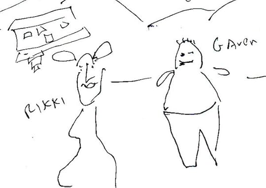 I got interested in the awkwardly drawn figures in the lower right corner of my drawing. It’s hard to draw that badly and childishly if you’re paying attention. Expression at a deeper level. Despite the labeled names in my original sketch, I now think of these two as being my characters Morton and Loulou.