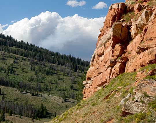 It's located in a valley gouged out by the narrow and snaky Gros Ventre River—more of a creek than a river. Two sides of the valley are lined with sheer red bluffs. The upstream end of the valley slopes up into a forest with a waterfall.