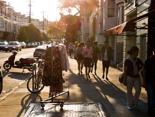 I had a little moment of that joy-with-the-given at the San Francisco airport, simply enjoy-ing the architecture, the awesome height of the vaulted hall, the light glancing off the shiny stone floors and rendering everything in shades of greenish gray, and us travelers scattered about like the stylized figures in a maquette.
