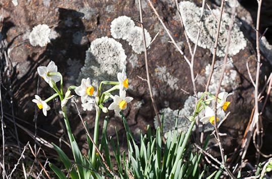 Before getting back on the road in the morning, Alan took a walk, admiring the clumps of prickly pear cactus, the lobbed with buds along their rims, and with yellow and red flowers sprouting amid the thorns. He liked how the cacti were so perfectly placed among the grasses and the dry red rocks. Nature's wise and lovely designs, at the fertile border between order and chaos. Little lizards lifted up their striped tails to run away.